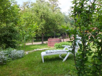 Für jede Witterung und jeden Zweck, sei es zum Frühstück, zum gemütlichen Beisammensitzen oder einfach nur zum Lesen, finden Sie schöne Sitzplätze auf dem Grundstück, eine überdachte Veranda direkt vor der Küche, gepflasterte Terrasse vor dem Hauseingang oder Bank unter dem großen Obstbaum.